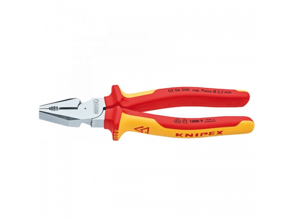Пассатижи силовые 1000 v Knipex KN-0206200 универсальный инструмент для выполнения различных работ например, захвата и удержания различных материалов, разрезания проволоки, проводов, электромонтажных и других работ. Специальные двухкомпонентные чехлы предназначены для надежного захвата, удержания пассатижей и защиты оператора от поражения электрическим током. Оптимизированное передаточное отношение и передача усилия позволят затрачивать на 35% меньше энергии для выполнение реза.