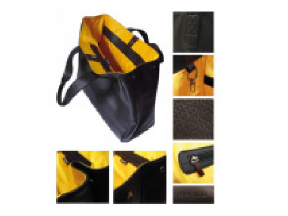 Из зернистой кожи. Закрывается на магнитную застежку. 2 боковые застежки на кнопке. Внутри несколько отсеков. Брелок с карабином внутри. Желтая подкладка из хлопка. Цвет: черный / желтый. Тисенение логотипа Renault на передней стороне. Размеры: 40 x 33.5 x 16 см. Поставляется в защитном чехле с логотипом Renault.