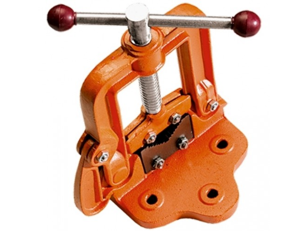 Отличаются фиксацией зажимаемого материала сверху вниз. Приспособление надежно закрепляется на поверхности с помощью болтов. Тиски применяются для фиксации труб.
