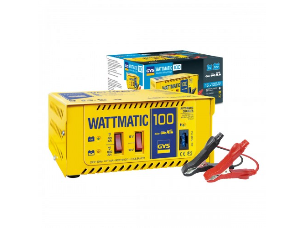 GYS Wattmatic 100 зарядное устройство позволяет заряжать свинцовые аккумуляторные батареи с жидкостным или гелиевым электролитом 6 и 12В легковых автомобилей и микроавтобусов. Особенности - Автоматическая зарядка, без надзора - Зарядка без отсоединения АКБ - 2 режима зарядки - 3 световых индикатора: подключен к сети, в процессе зарядки, АКБ заряжена Технические характеристики Наименование Значение Напряжение зарядки 6-12 В Емкость аккумуляторов 6 В 15-40 Ач Емкость аккумуляторов 12 В 40-100 Ач Напряжение питания 220 В Мощность 140 Вт Ток 1й ступени регулировки 3,5 А Ток 2й ступени регулировки 6,5 А Предохранитель 15 A Габаритные размеры 230х260х120 мм Вес 4 кг
